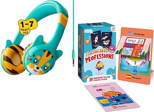 Kidrox Tiger Wired Toddler Headphones – 85dB Volume Limited Headset with Adjustable Headband for Kids 1–7 Bilingual Professions Flash Cards – 30 English/Spanish Learning Cards for Toddlers