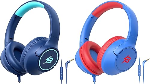 [Navy + Blue] Kids Headphones for School Travel, 85/94dB Volume Litmit, HD Mic Stereo Sound Over-Ear, Foldable 3.5mm Wired Kids Headphones for Toddler Girls Boys Tablet