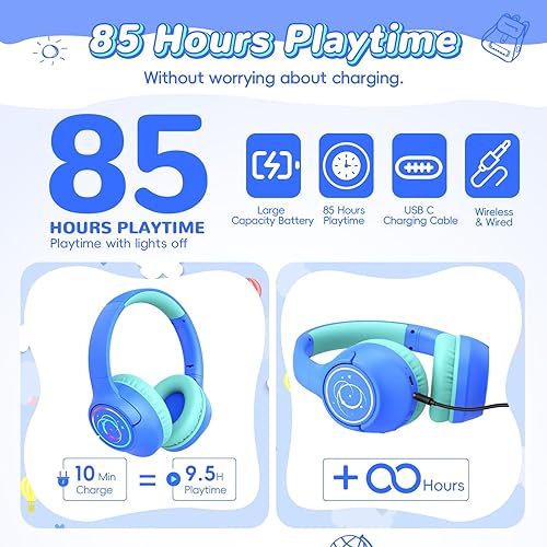 [Blue + Purple] Kids Bluetooth Headphones, 85H Playtime Wireless Headphones for Kids, Colorful LED Lights, 85/94dB Safe Volume Limit, Bluetooth 5.4 Built-in Mic Toddler Headset