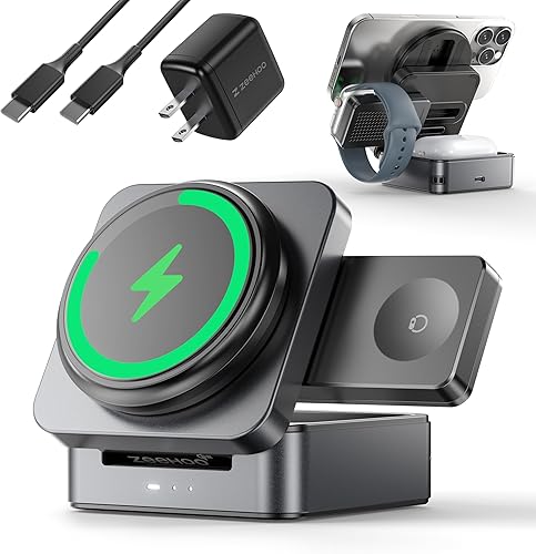ZEEHOO 3-in-1 Foldable Magnetic Wireless Charging Station, Qi2 Certified 15W Travel Charger Stand Dock for iPhone 17/16/15/14/13/12 Series, Apple Watch, AirPods(30W Adapter Included) (Gray)