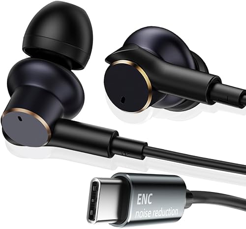 USB C Wired Headphones with Noise-Canceling Mic,Dual-Driver Noise-Isolating Wired Earbuds with Call Noise Reduction,Type C Plug Deep Bass in Ear Earphones with DAC,Powerful Bass and HD Sound (Black)