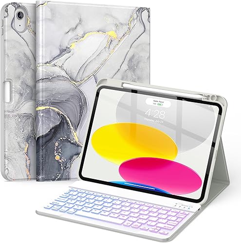 Soke for iPad (A16) 11th/10th Generation Case with Keyboard(2025/2022)-7 Color Backlight Wireless Detachable Folio Keyboard Cover with Built-in Pencil Holder for iPad 11/10.9 inch, Ice Blue Marble