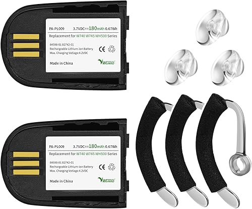 2-Pack 84598-01 82742-01 Battery Upgraded 180mAh for Plantronics Savi WH500 W745 W740 W440 W445 W02 CS540XD 204755-01 Headsets Replacement with 3-Pack Earhooks Spare Earbuds Foam Tube Kit