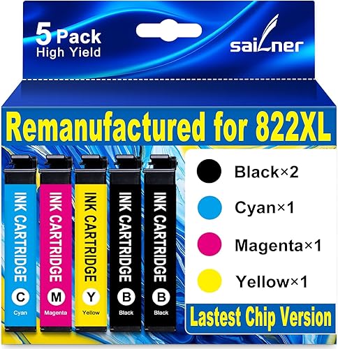 822XL 822 Ink Cartridges High Yield Remanufactured for Epson 822XL Ink Cartridges 822 XL T822 for Epson Workforce Pro WF-3820 WF-4830 WF-4820 WF-4830 WF-4833 WF-4834 Printer (5 Pack, BCMY)