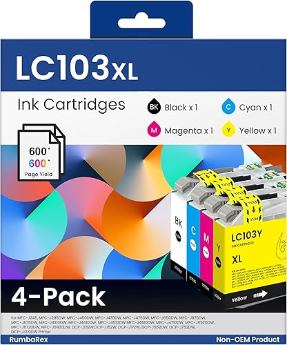 LC103 LC103XL Ink Cartridges High-Yield Replacement for Brother LC101 LC103 LC103CL Ink Cartridges for MFC-J870DW MFC-J475DW MFC-J6920DW MFC-J470DW Printer Ink 4-Pack (Black Cyan Magenta Yellow)
