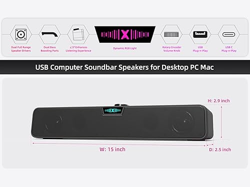 Computer Soundbar Speakers for Desktop PC Mac, USB Plug-in, Wired, External Speakers for Laptop Desk Monitor, RGB Gaming Sound bar with HD Stereo Loud Sound, Punchy Bass, Volume Knob, USB C Adapter