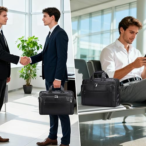 Masa Kawa Black Leather Briefcase for Men, Waterproof 16 Inch Laptop Computer Case, Crossbody Shoulder Messenger Bag for Business Travel, Office Work