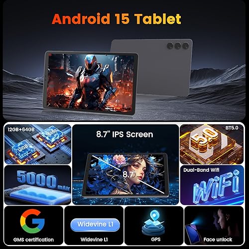 Android 15 Tablet 8.7 inch, Mini Tablet 5000mAh, Wi-Fi 6 & BT5.0, 11GB RAM & 64GB ROM 1TB Expandable, Tablet Computer with IPS HD Display, Support GPS, GMS, Widevine L1
