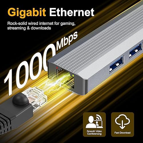 5-in-1 USB C Hub Adapter with Gigabit Ethernet, 2X USB 3.0 Ports, 2X USB C Data Ports, for Windows MacOS Linux Computers and Laptops