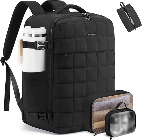 LOVEVOOK Large Travel Backpack for Women, TSA Carry on Backpacks for Airplanes, 40L Personal Item Travel Essentials Bag with 3 Packing Cubes, Waterproof Puffer Laptop Bag for Weekender Overnight Black
