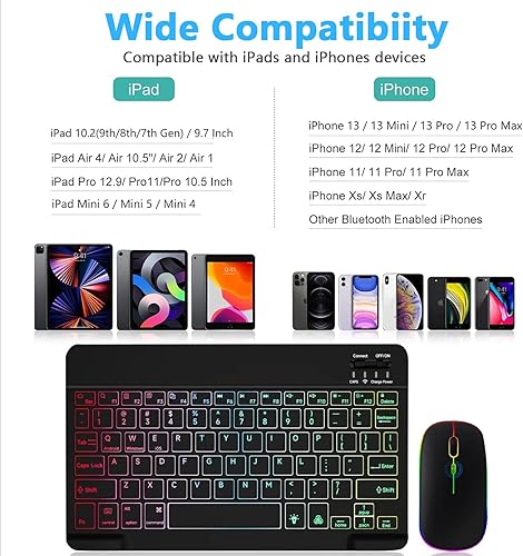 Bluetooth Keyboard and Mouse Combo for iPad Keyboard with 7-Color Backlit, Rechargeable Wireless Keyboard fit iPad 10th/9th/8th Gen, iPhone,Tablet, Smartphone iOS Android Windows