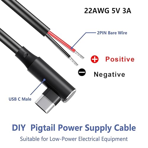 USB C Pigtail - USB C to 2 Pin Bare Wire Open End Power Cable, 90 Degree Right Angle Type C Male Plug (1M/3FT, 22AWG 5V/3A) for DIY Repair & Replacement – 5Pcs