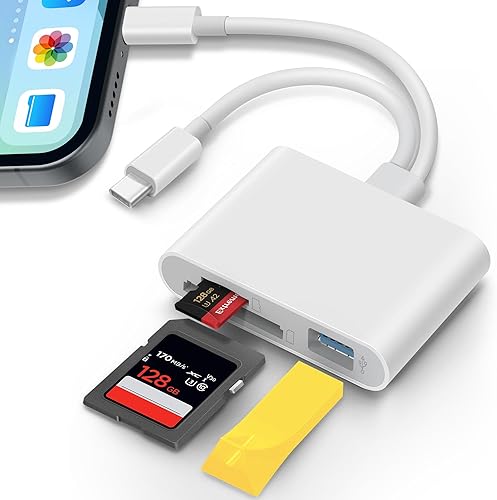 SD Card Reader for iPhone iPad Laptop 3-in-1 Connectors Memory Card Adapter with Dual Slots & USB Port Trail Game Camera Viewer for iPhone Mac MacBook Android Laptop White