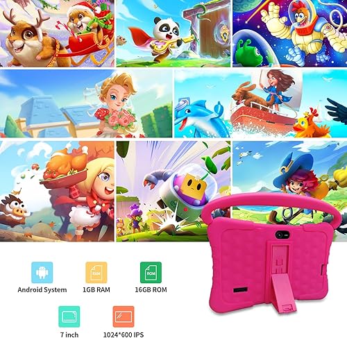Tablet Kids 7 inch with Shockproof Case, 1GB RAM 16GB ROM, Android OS Toddler Tablet with Bluetooth, WiFi, GMS, Parental Control, Dual Camera, Educational, Games