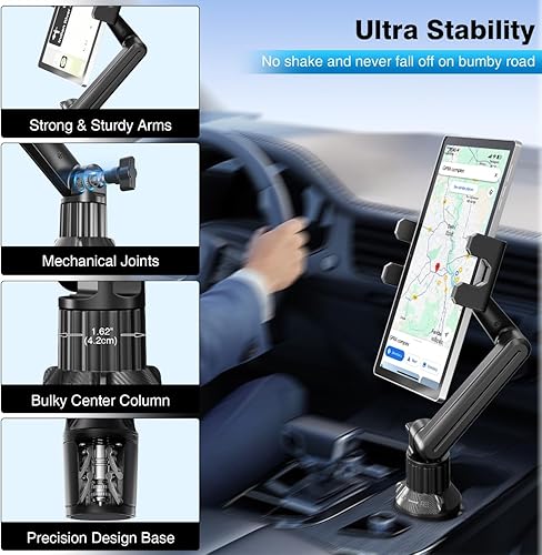Peastrex Cup Holder Car Tablet Mount, Ipad Cup Holder Car Mount with 15" Adjustable Arm Stand for Tablet iPhone 4.7-13in, iPad Pro Air Mini, Fire, iPhone 16 15, Galaxy S25 S24 Z Fold 6 5