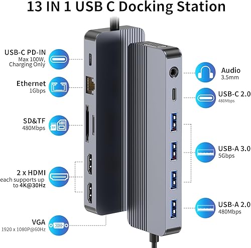 Docking Station 3 Monitors for HP/Dell/Lenovo/MacBook Laptop,13 in 1 USB C Hub, Computer Docking Station for Laptop with Dual HDMI,VGA,USB 3.0,Fast Charging Port,SD/TF Card Reader,3.5mm Audio
