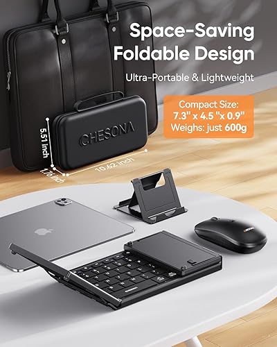 CHESONA Foldable Keyboard and Mouse Combo - Ultra Slim 600g with 2.4G+Dual Bluetooth Compact Wireless Folding Keyboard with Stand - Portable for Business/Travel with Case - Win/Mac/iOS/Android - Black