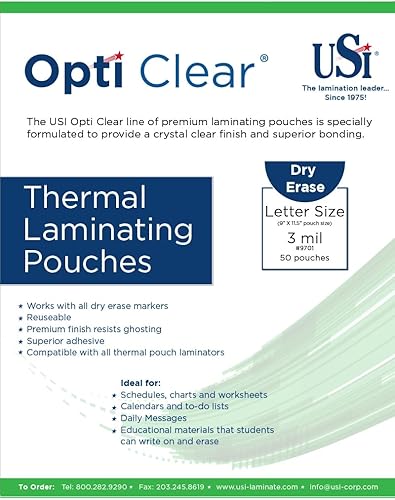 USI Opti Clear Dry Erase Laminating Pouches, Letter Size 9 x 11½ Inches, 3 Mil, 50 Pack