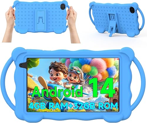 Kids Tablet 7 inch Android 14.0 for Toddler, 4GB RAM 32GB ROM Bluetooth IPS Screen Google Play YouTube Parental Control Dual Camera Shockproof Case for Educational Games (Blue)