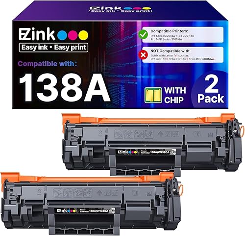E-Z Ink 138A W1380A Replacement for 138A Black Laserjet Toner Cartridge W1380A 138X W1380X Compatible with Pro 3001dw 3001fdw MFP 3101fdw Series Printer (with Chip, 2 Black)