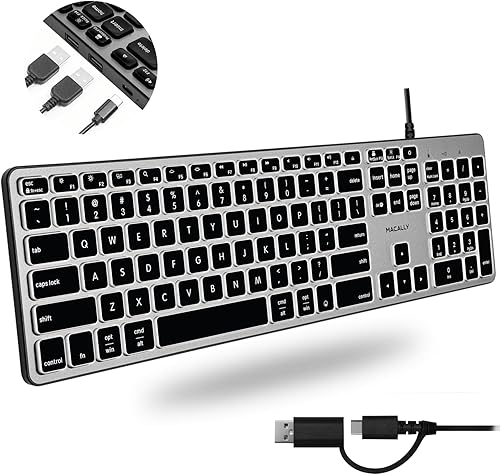 Macally Wired Keyboard for Mac with USB Hub (2X USB-A / 1x USB-C) - Compatible Backlit Apple Keyboard with Dual Interface - Auto OS Detection for Mac, MacBook, iMac, PC, Android, iPad, iOS - Silver