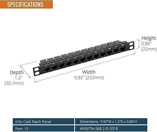 Tecmojo 12-Port Cat6 Patch Panel, 0.5U Rack Mount Modular Panel with Keystone Coupler, for 10" Server Rack & Network Cabinet, Gigabit Ethernet, Black