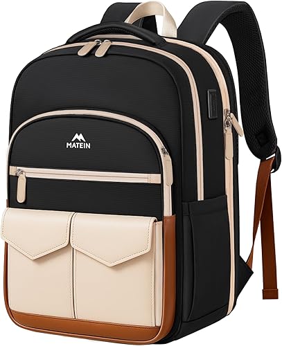 MATEIN Laptop Backpack for Women with Expanding File Folder, Water Resistant Work Backpack with Charger, Lightweight Causal Daypack Fits 15.6" Laptop, Stylish Computer Bag for Nurse, Teacher, Black
