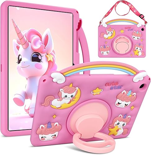 VOFUOE for Samsung Galaxy Tab A9 Plus Case for Kids Girls with Shoulder Straps 360 ° Rotating Stand Rainbow Unicorn Soft Silicone Protective Cover for Galaxy Tab A9+ 11 Inch 2023- Hot Pink