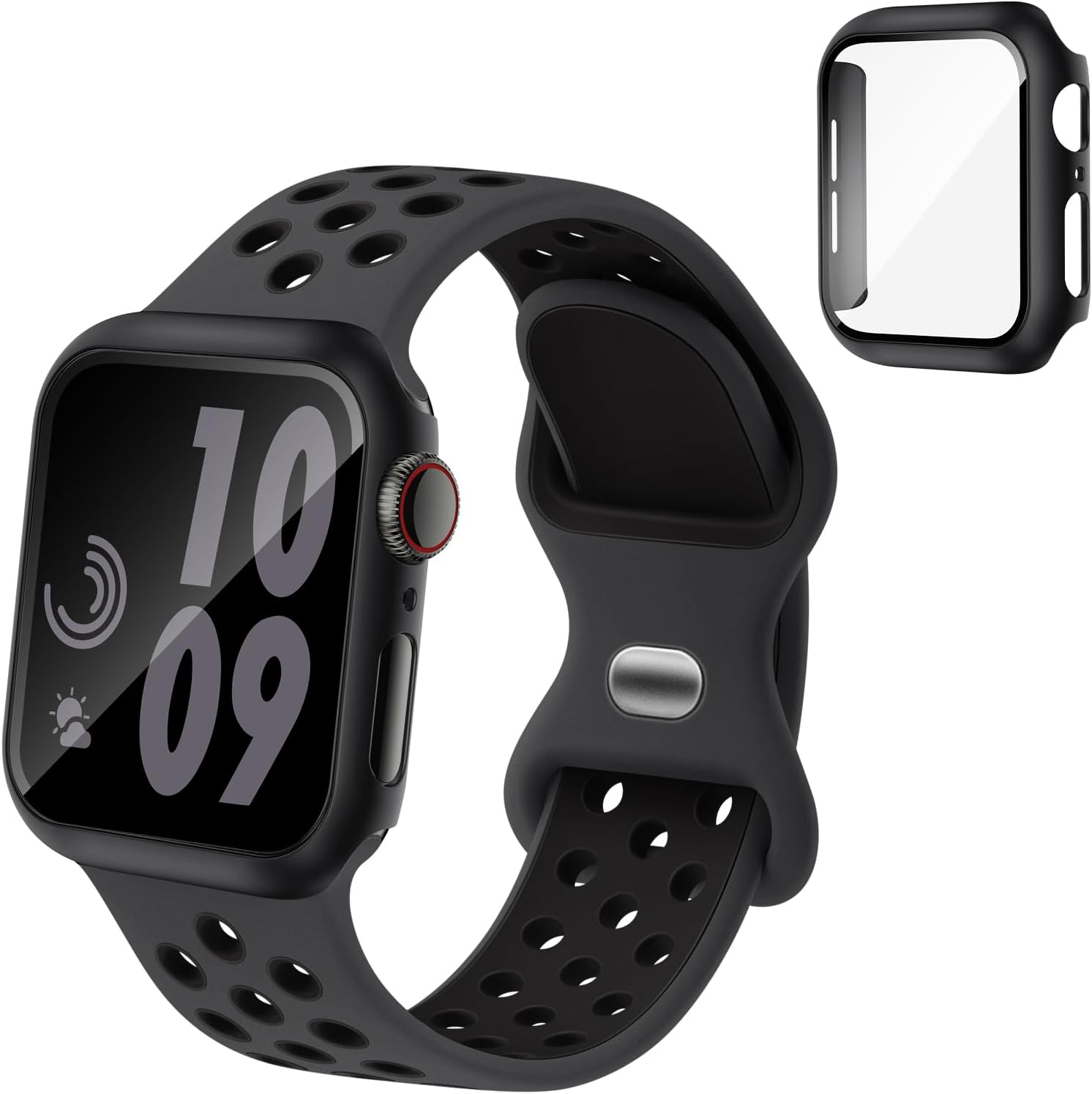 Sport Silicone Bands and Case with Screen Protector Compatible with Apple Watch Band 44mm/45mm/46mm/42mm/41mm/40mm for Men, Breathable Strap and Cover Combo for iWatch Series 11/10/9/8/7/6/5/4/SE