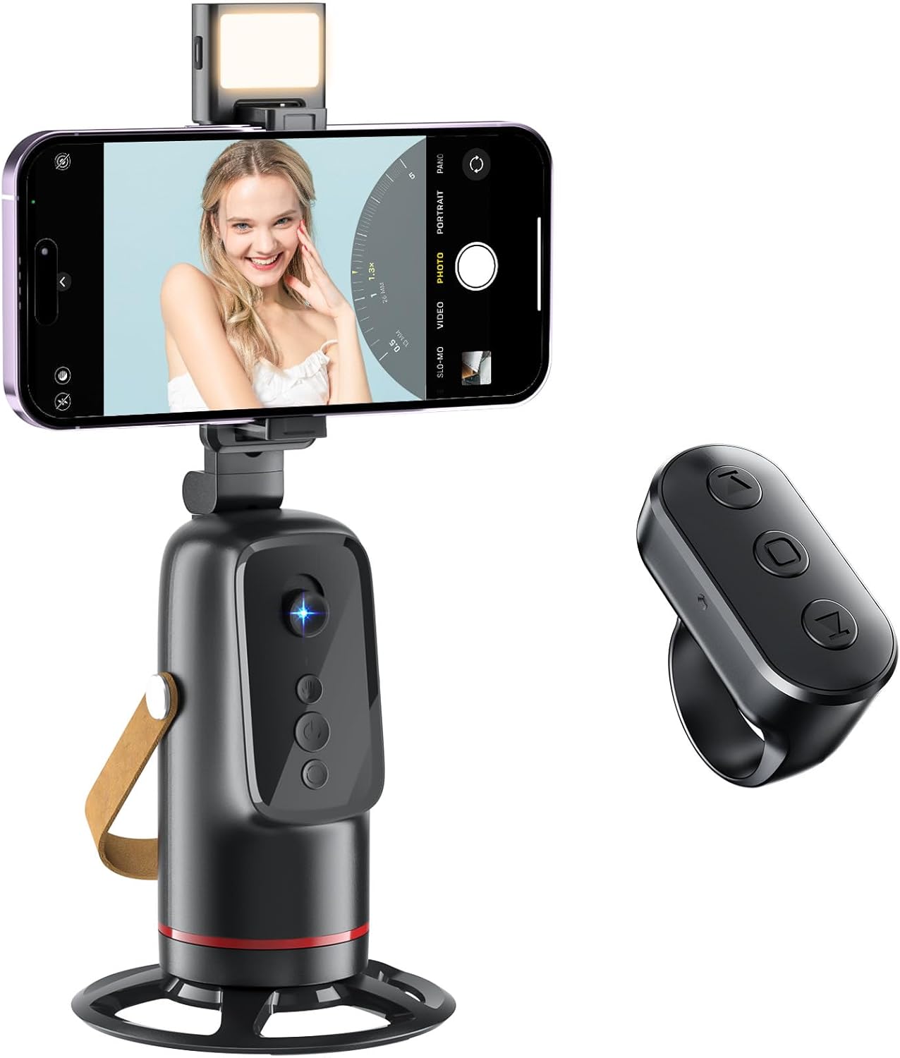 Auto Face Tracking Phone Holder with Remote and Light, 360° Rotation Tripod Stand for Call Phone, GoPro, Compact Camera, Hands Free Shutter with Zoom & Front/Rear Camera Switch for iPhone Android