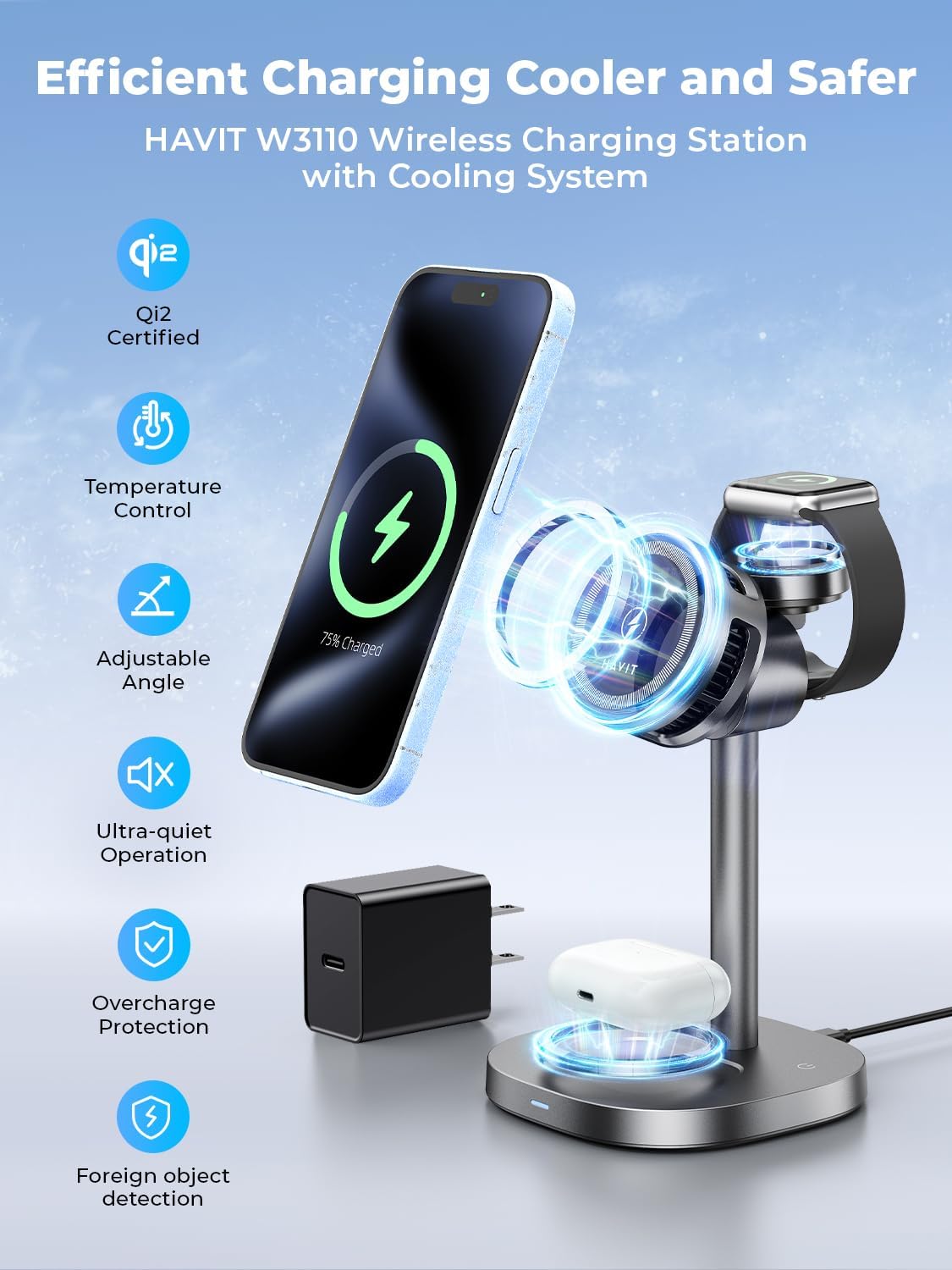 havit 3 in 1 Wireless Charging Station, Qi2 15W Cooling Magnetic Charging Stand, MagSafe Fast Wireless Charger for iPhone 17/16/15/14 Series, Apple Watch, AirPods, 45W Adapter Included