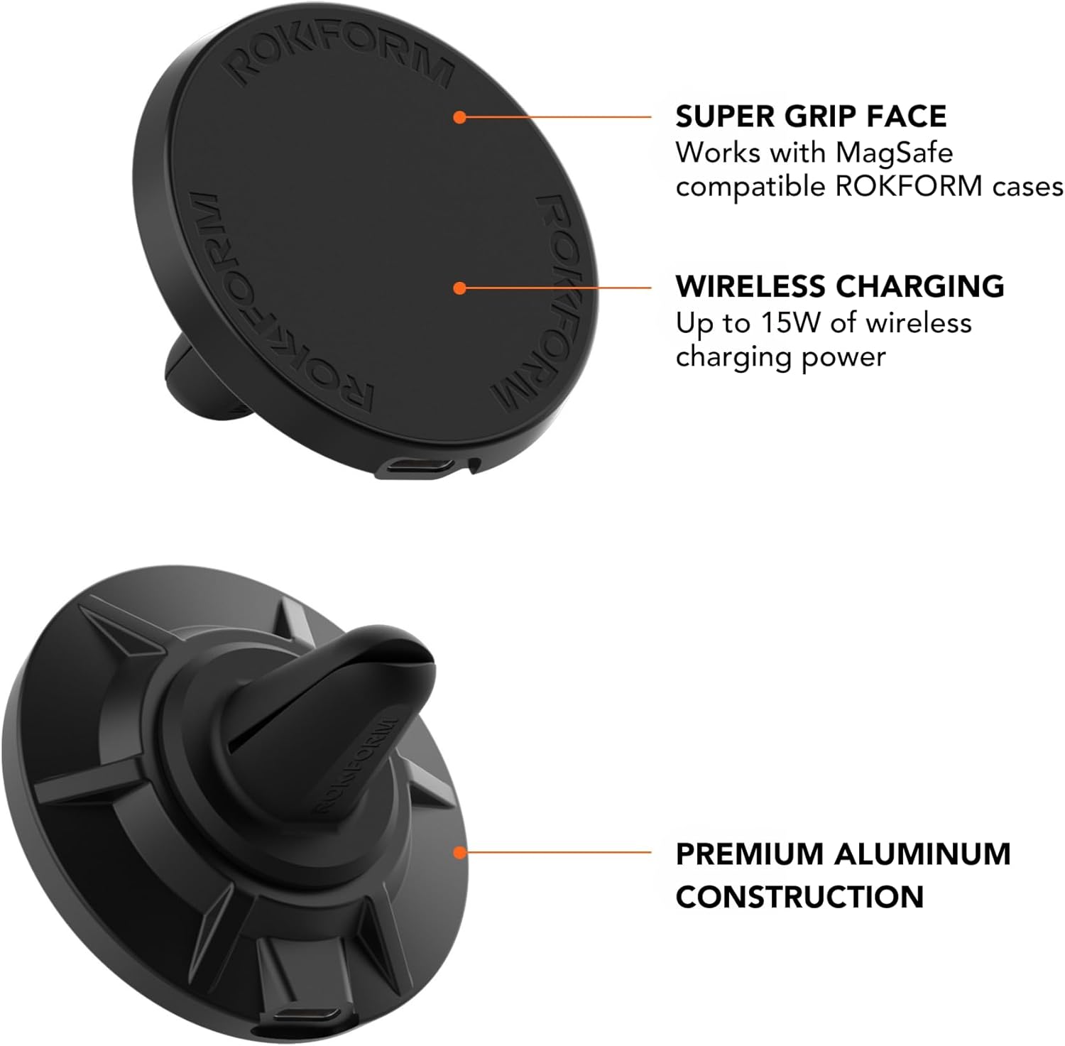 ROKFORM Wireless Car Charger, Magnetic Vent Mount, Compatible with Mag Safe Phone Cases, Super Grip Clip, USB-C to USB-C Cable Included (Black)