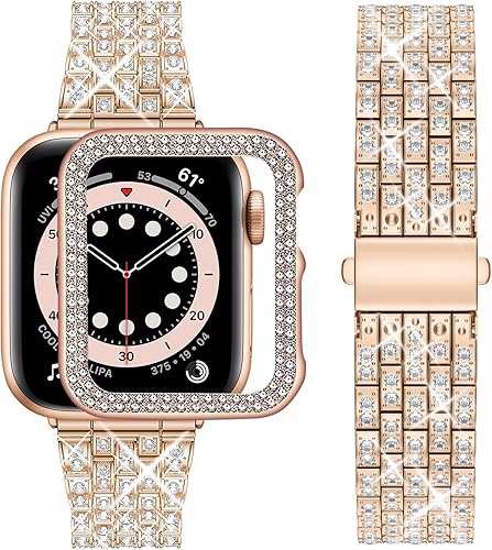 wutwuk Diamond Band with Bling Case Compatible with Apple Watch Bands for Women 42mm, Sparkly Metal Strap with Crystal Protective Bumper for iWatch Series 11 10, 42mm Rose Gold