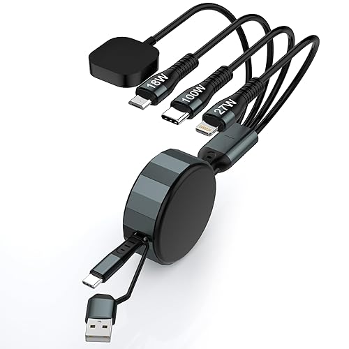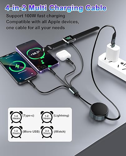 100W Retractable Charging Cable with Apple Watch Charger - 4 in 1 Retractable Multi Charger [Apple Watch+USB C+Lightning+Micro USB Cord] for iWatch iPhone 16 15 14 13 Android Phone iPad Tablet Laptap