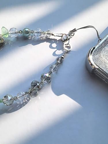 Crystal Beaded Phone Lanyard Chain Cellphone Wrist Strap Bracelet Wristlet, with Butterfly Charm, Iridescent Glass Beads, Mint Green Accents