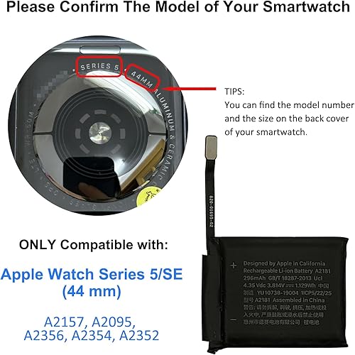 Replacement Battery Kit Compatible with Apple Watch Series 5 & SE 44mm A2181, with Tools, Manual, Tape
