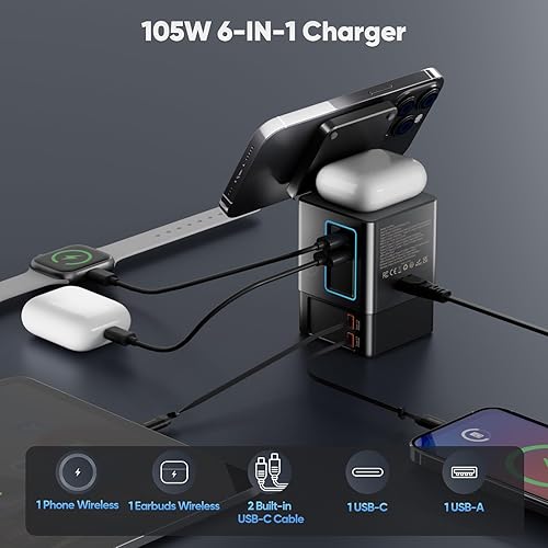 6-in-1 Charging Station for Apple 105W, Magnetic Wireless Charger with 65W Retractable Cable, Wireless Charger Stand, Fast Charging Stand Dock for MagSafe, iPhone17-13 Series, AirPods, Laptops