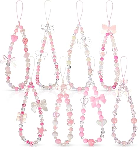 Tondiamo 8 Pcs Pink Phone Charms Strap Y2k Phone Charm Wrist Strap Aesthetic Beaded Cellphone Lanyard Cute Bow Butterfly Heart Star Flower Anti Theft Chain String for Women Bag Keychain Camera Pendant