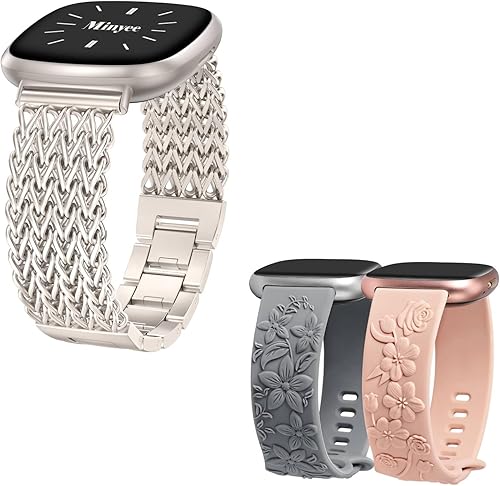 Minyee 2 Packs Compatible with Fitbit Sense 2/Versa 4/Versa 3/Sense Bands Women, Dressy Stainless Steel Multi-chain Luxury Link Bracelet & Cute Embossed Silicone Wildflower Rose Floral Engraved Band