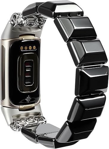 Compatible with Fitbit Charge 6 / Charge 5 Bands, Beaded Stretch Bracelet Replacement Wristband for Women Men, Elastic Natural Energy Stone Strap, Black Fits 7"-8" Wrists