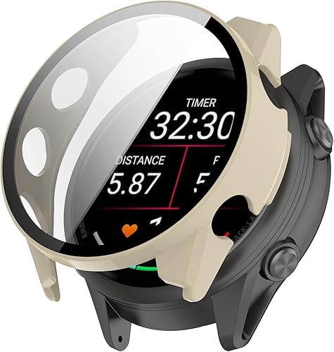 Hard Case for Garmin Forerunner 570 42mm/47mm with Screen Protector, Hard PC Protective Case Shockproof Anti-Scratch Bumper Cover with Tempered Glass (Beige, Garmin Forerunner 570 42mm)