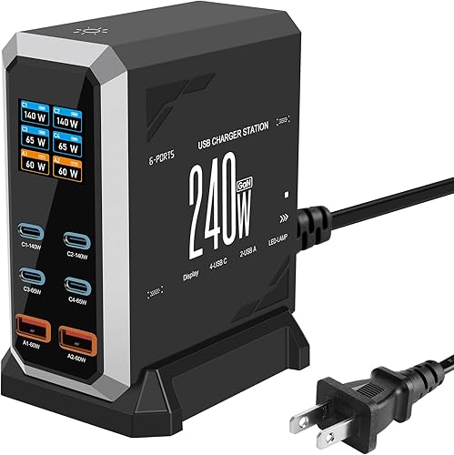 USB C Charger Block, 240W GaN USB C 6-Port Charger Station, Laptop Power PD Adapter with Touch Control and Color Display, Charging Station for MacBook, iPhone, Samsung, Laptop, iPad, Desktop, and More