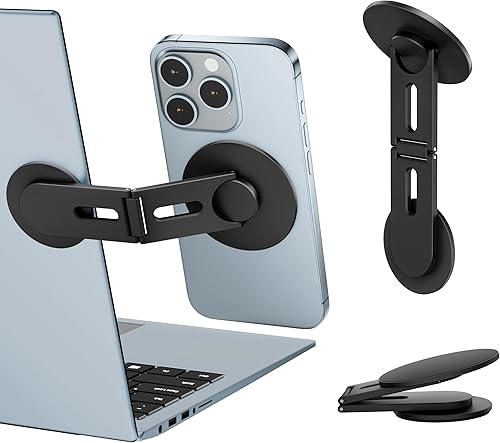 Magnetic Laptop Phone Holder Compatible with MagSafe iPhone, Dual-Axis 180° Adjustable Side Phone Mount, Slim Portable Foldable Stand for Computer/Tesla/Monitor/Treadmill, Silver