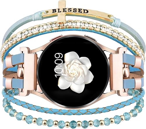 Boho Leather Bracelet for Samsung Galaxy Watch 8/7/6/5/4 Band 40 44mm Women, 20mm Cute Beaded Multilayer Strap for Galaxy Watch 8 Classic 6 4 Classic 43mm 47mm 42mm 46mm/Watch 5 Pro 45mm /Active2