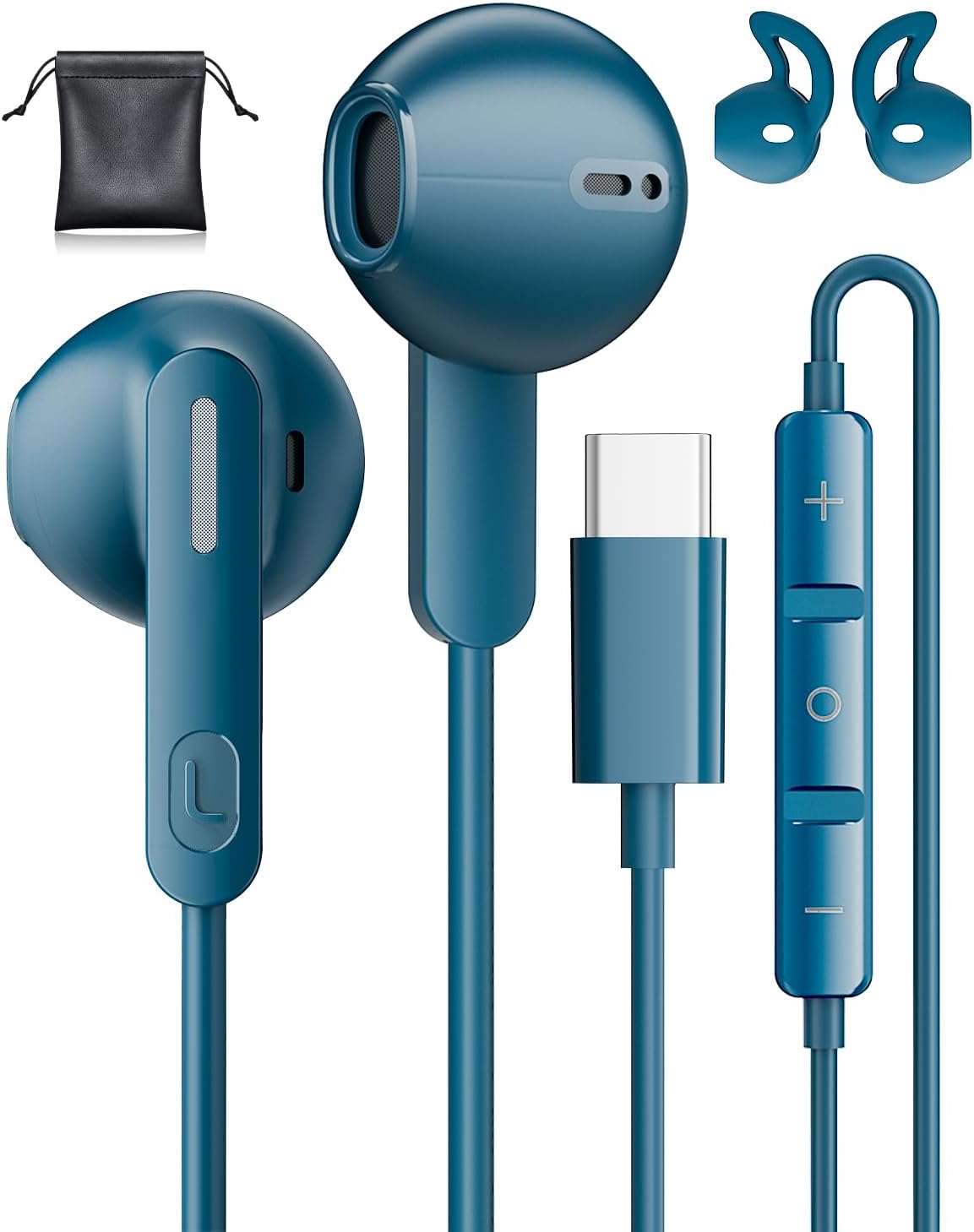 Wired Earbuds USB C for Samsung Galaxy S25 S24 S23 Ultra S22 A56 A16 iPhone 16 Pro Max 15 17 Air iPad 10 Pro USB C Headphones with Microphone Volume Control HiFi Stereo Type C Headphones Wired Xiaomi