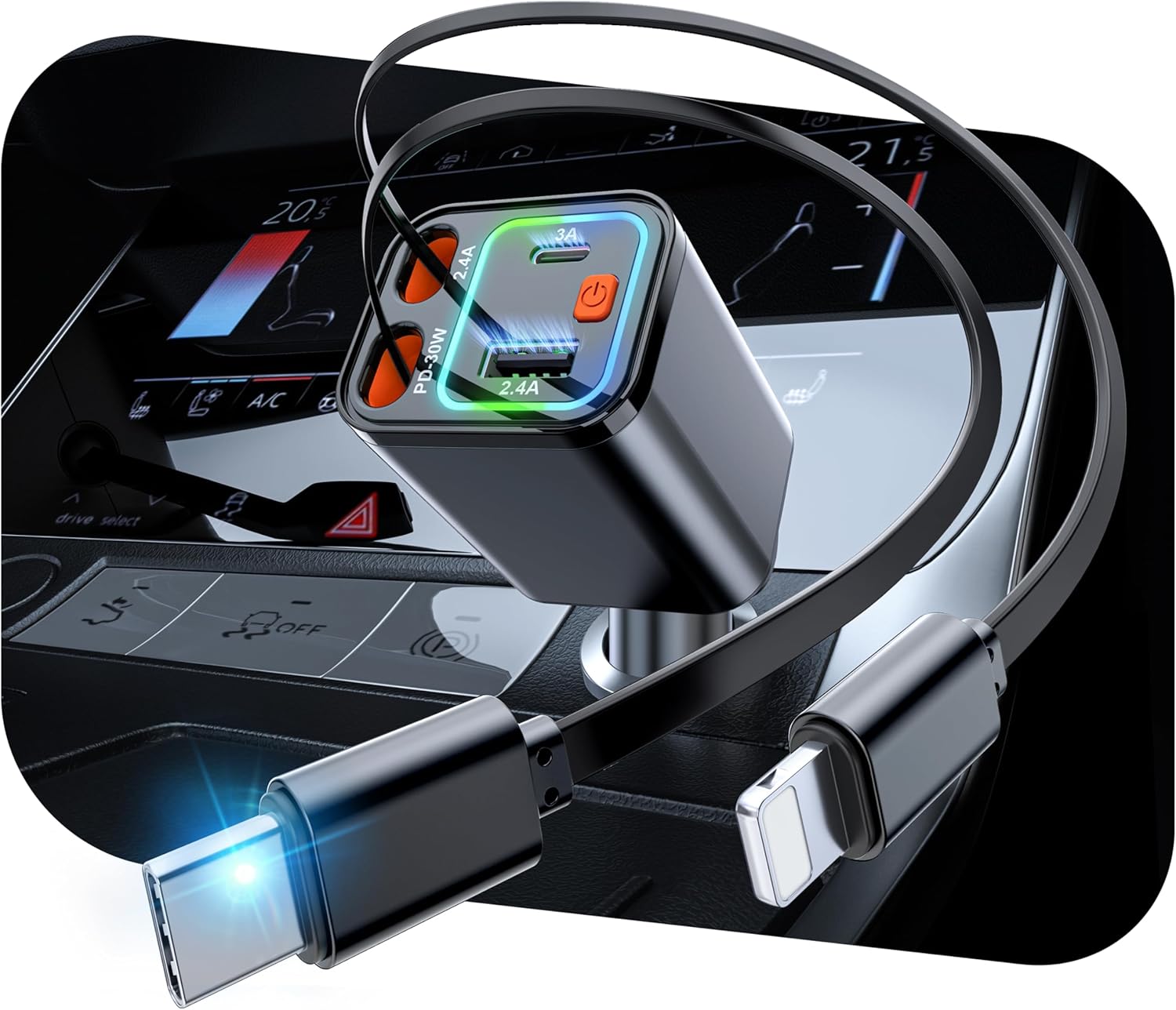 69W Retractable Car Charger, 4-in-1 Fast Car Phone Charger with 2.6ft Two Retractable Cables and USB C+USB A Car Charging Block Cube, Compatible with iPhone 15 16 17 Pro Max Plus,Galaxy,Pixel(Purple)