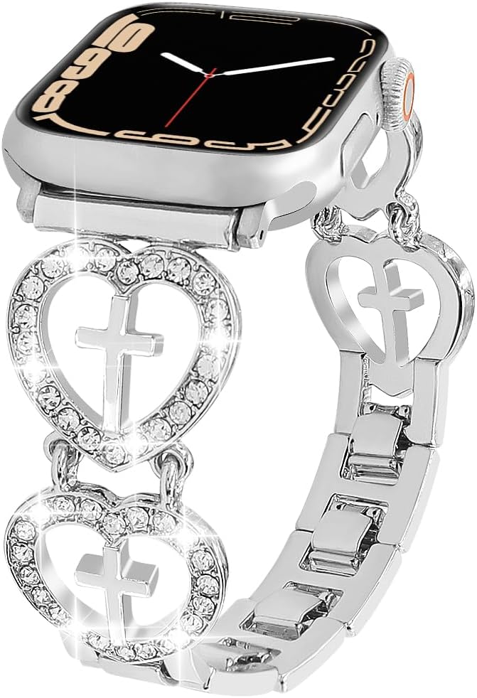 Bling Metal Bracelet Compatible with Apple Watch Band 40 41 42 44 45 46 49 38mm Women,Cross Band Love Heart Shape Wristband for iWatch Series 10 9 8 7 6 5 4 3 2 SE Ultra 2
