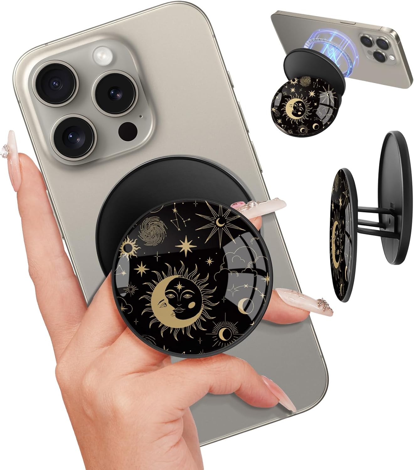 Kidcube Magnetic Phone Grip Compatible with Magsafe - Cell Phone Grip Stand Magnetic Ring Holder Finger Kickstand for iPhone 16 15 14 13 12 Series Magnet Removable Accessories Cute Sun Moon Sign