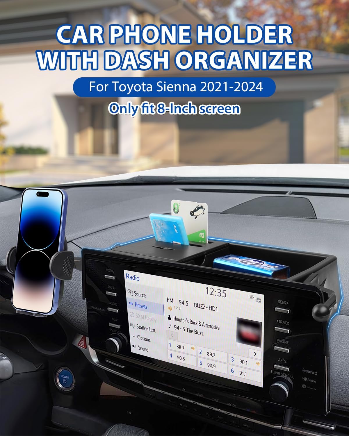 Autorder Car Phone Holder for 2021-2024 Toyota Sienna Accessories Center Console Dash Organizer with Dedicated Card Coin Storage Box 360°Rotation Phone Mount Hands-Free (Only for 8'' Screen)
