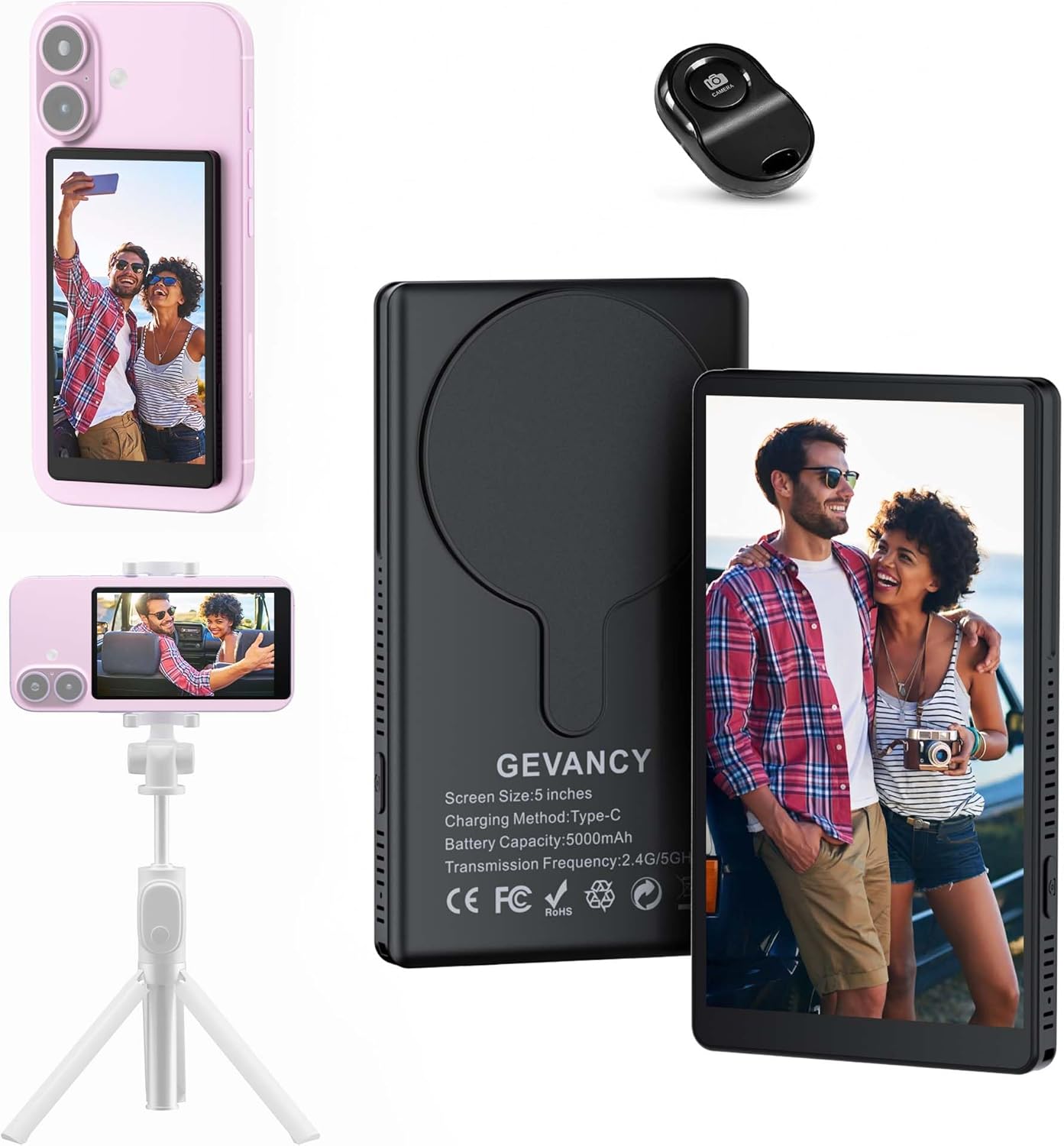 Vlog Selfie Monitor Screen with Touchscreen (5"), 5000mAh Magnetic Phone Vlog Selfie Monitor Screen, Back Camera Monitor Supports 4K 60fps for Vlog Live Stream TikTok, Compatible with iPhone & Android